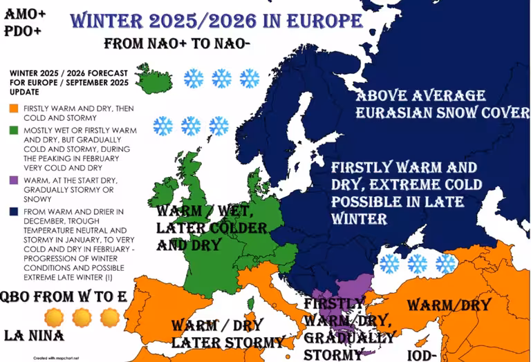 Фахівці MkWeather наголошують, що зима 2025/2026 обіцяє стати однією з найбільш непередбачуваних за останні роки. Європі слід готуватися до нестабільного та холодного зимового сезону.