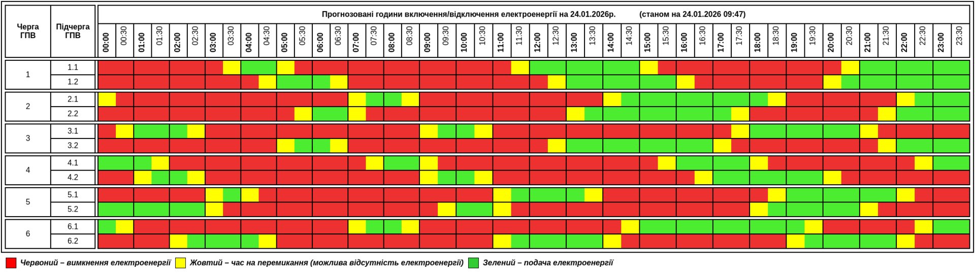 24 січня в помешканнях жителів Тернопільщини світло буде в середньому 7 з 24 годин. Задіяно шість черг, в кожній з яких є дві підчерги. Одноразові відключення тривають до 6-7 годин.