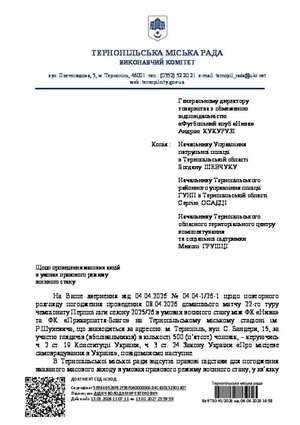31 березня 2026 року клуб надсилає офіційний лист міському голові: «Орендар має намір припинити дію Договору оренди шляхом його розірвання за взаємною згодою сторін». Підпис, печатка, вихідний номер.Інвестори стверджують, що міська влада безпідставно не погоджуються проведення футбольних матчів. Але факти вперта річ - підстави є три - відсутність договорів щодо укриттів (і це в той час, коли Тернопіль під час обстрілу 19 листопада 2025 року втратив більше 40 невинних життів), незадовільний стан газону (висновок комісії з фахівцем), проведення попереднього матчу без дозволу. Лист «інвесторів» ігнорує всі три.