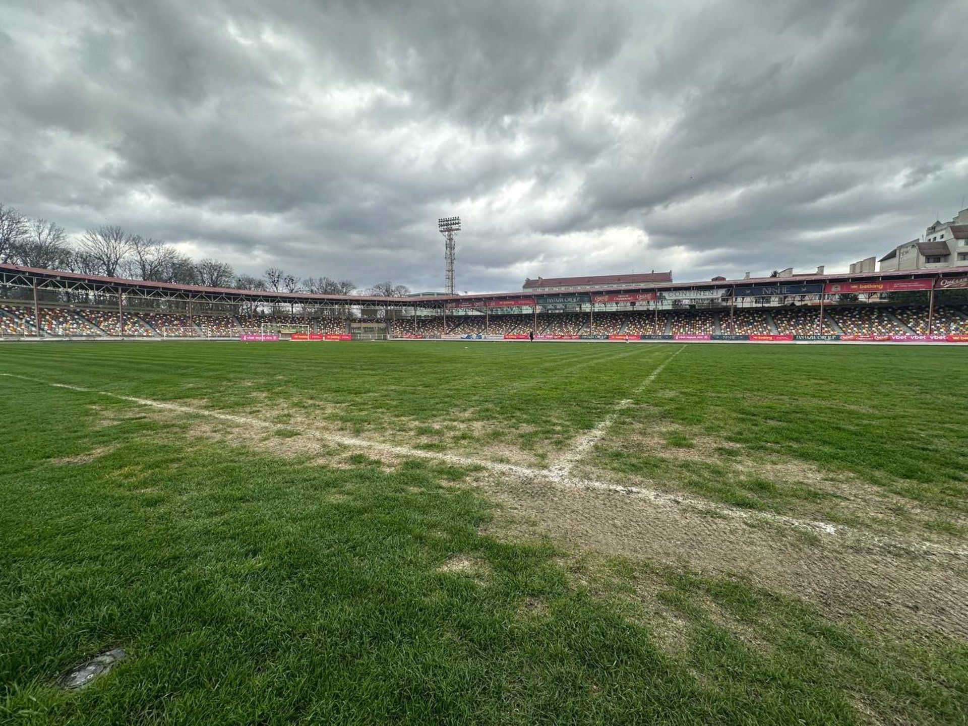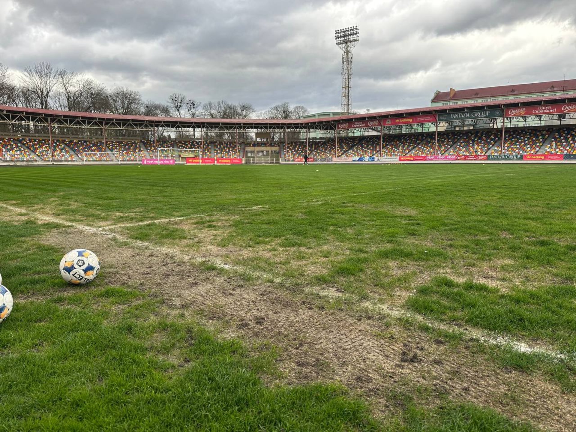Комісія зафіксувала: газон стадіону у незадовільному стані. Витоптані та оголені ділянки, бур'яни, ущільнений ґрунт, відсутність будь-якого догляду. Біля воріт - болото. На момент передачі в оренду газон був у задовільному стані - це зафіксовано документально.