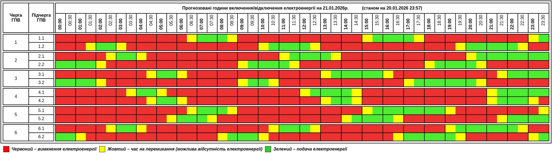 Згідно графіку енергетиків 20 січня в помешканнях жителів Тернопільщини світло буде в середньому 6 з 24 годин. Задіяно шість черг, в кожній з яких є дві підчерги. Одноразові відключення тривають до 6-7 годин.