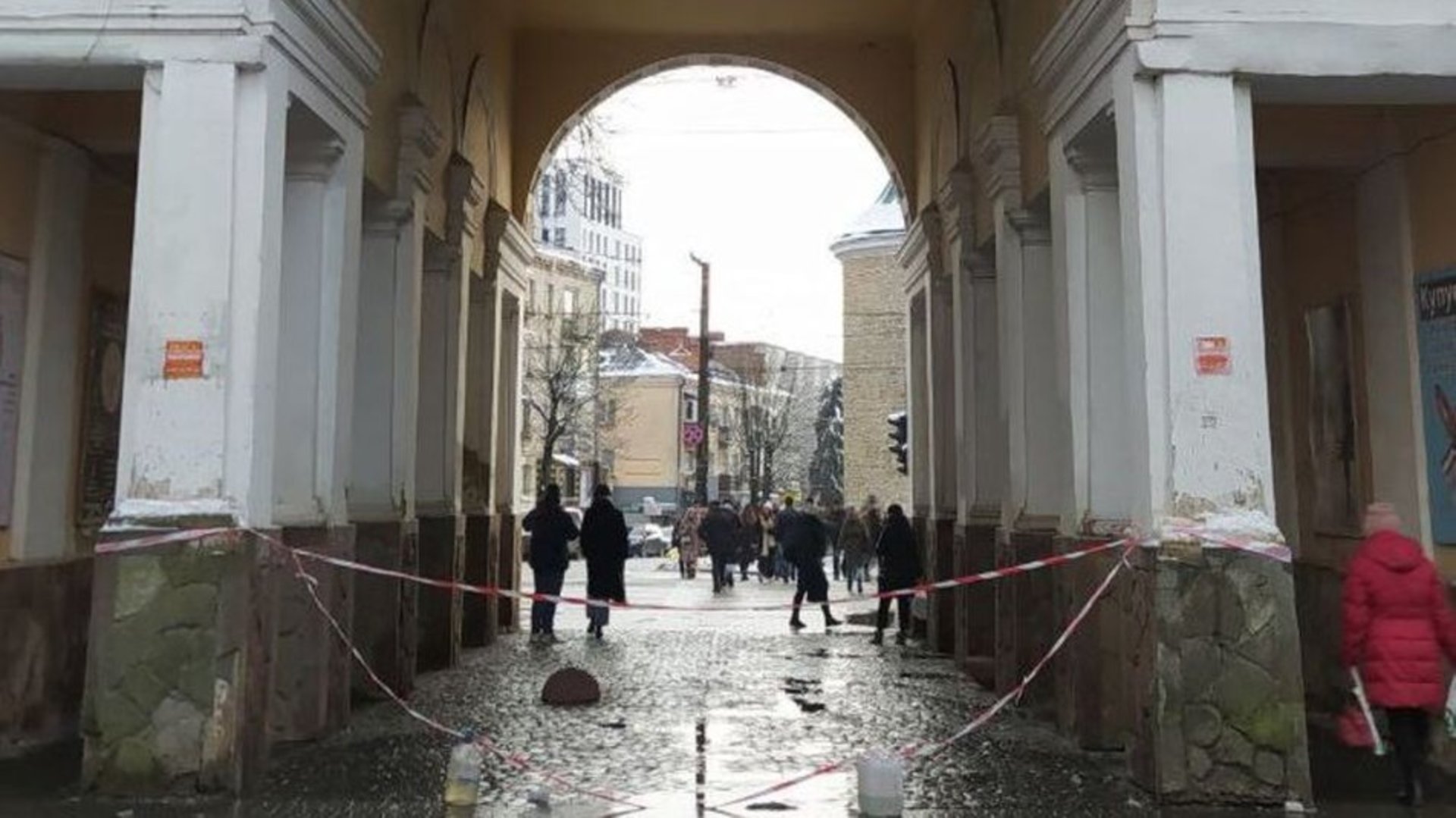 Під аркою на вулиці Валовій стрічкою відгородили частину проходу, над яким з балконів впало кілька бурульок та льодових брил з даху. Перехожі оминають небезпечне місце боковими арками.