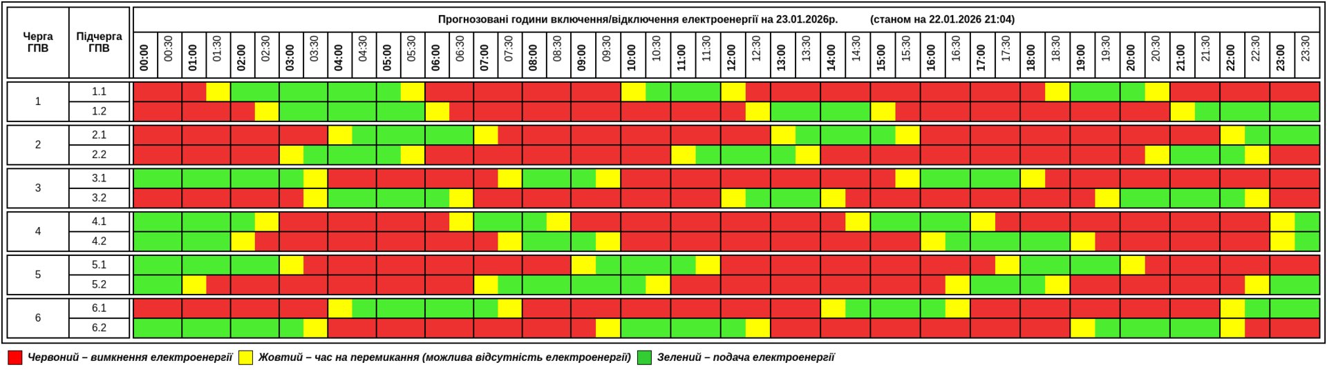 23 січня в помешканнях жителів Тернопільщини світло буде в середньому 7 з 24 годин. Задіяно шість черг, в кожній з яких є дві підчерги. Одноразові відключення тривають до 6-7 годин.