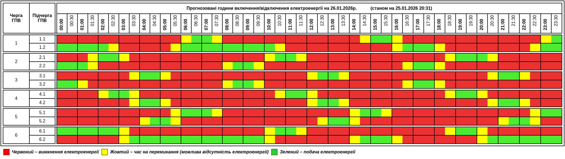 26 січня в помешканнях жителів Тернопільщини світло буде в середньому 7-8 з 24 годин. Задіяно шість черг, в кожній з яких є дві підчерги. Одноразові відключення тривають до 5-6 годин.