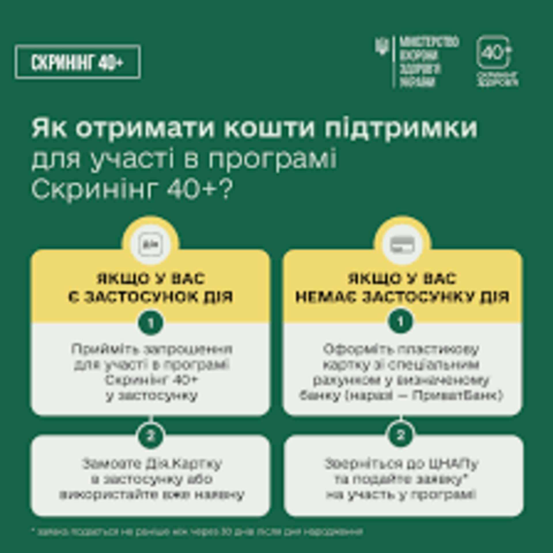 В області пройти обстеження за програмою «Скринінг здоровʼя 40+» можна в 40-ка медзакладах. Як розповіла директорка департаменту охорони здоров’я області Ольга Ярмоленко, участь у програмі безкоштовна. «Через 30 днів після дня народження люди віком 40 років і старше отримують у застосунку «Дія» повідомлення з пропозицією пройти скринінг. Після підтвердження участі на «Дія.Картку» зараховується 2000 грн., кошти можна використати виключно для проходження Скринінгу здоровʼя 40+. Людина самостійно обирає медичний заклад із затвердженого переліку — державний, комунальний або приватний, незалежно від місця проживання чи реєстрації. Оформити участь у програмі «Скринінг здоровʼя 40+» можна також у центрах надання адміністративних послуг».
