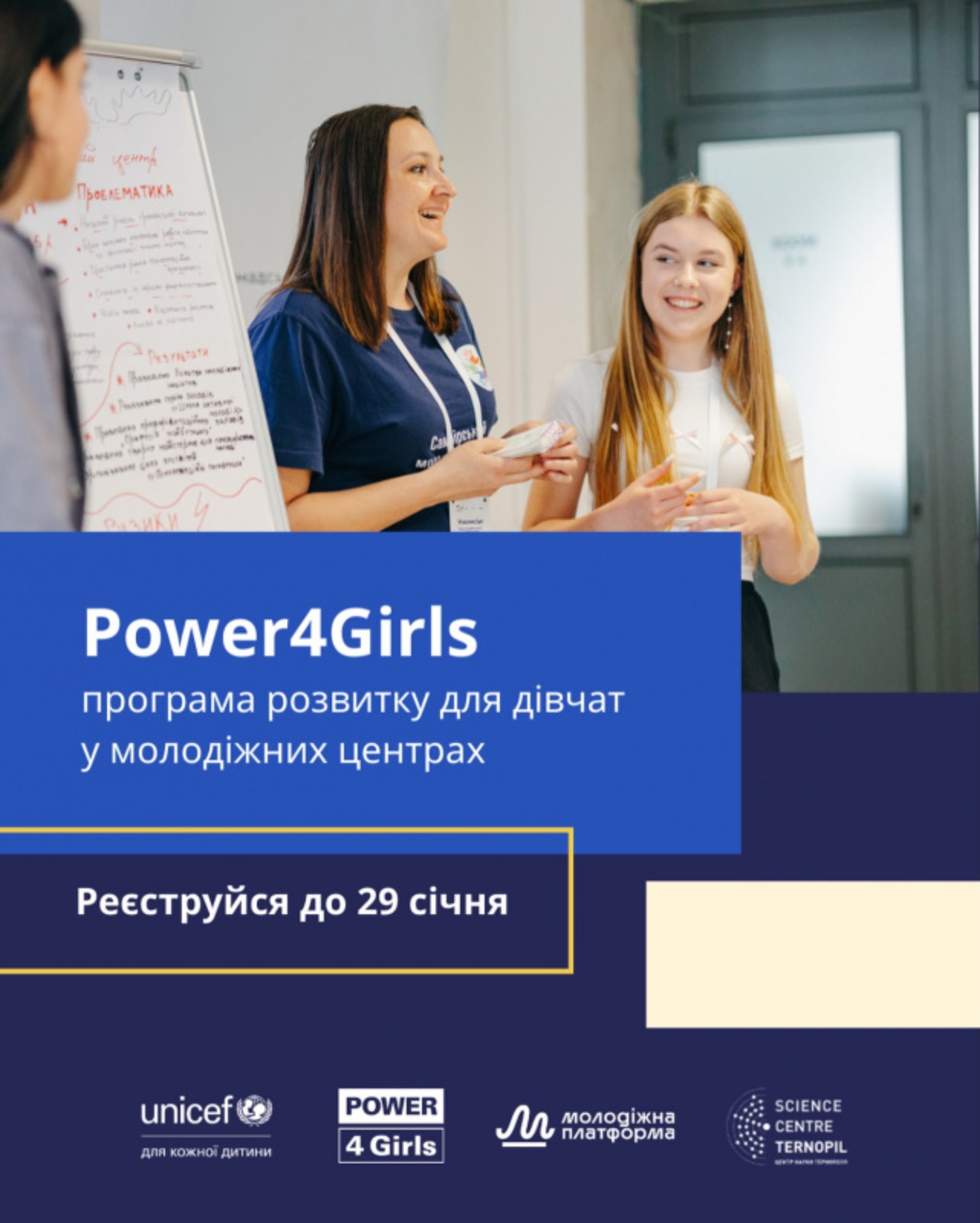 У Тернополі стартує програма розвитку для дівчат «POWER4GIRLS». Серія безкоштовних зустрічей проходитиме в Молодіжному центрі при «Центрі науки Тернополя» та орієнтована на дівчат віком 14-24 років.