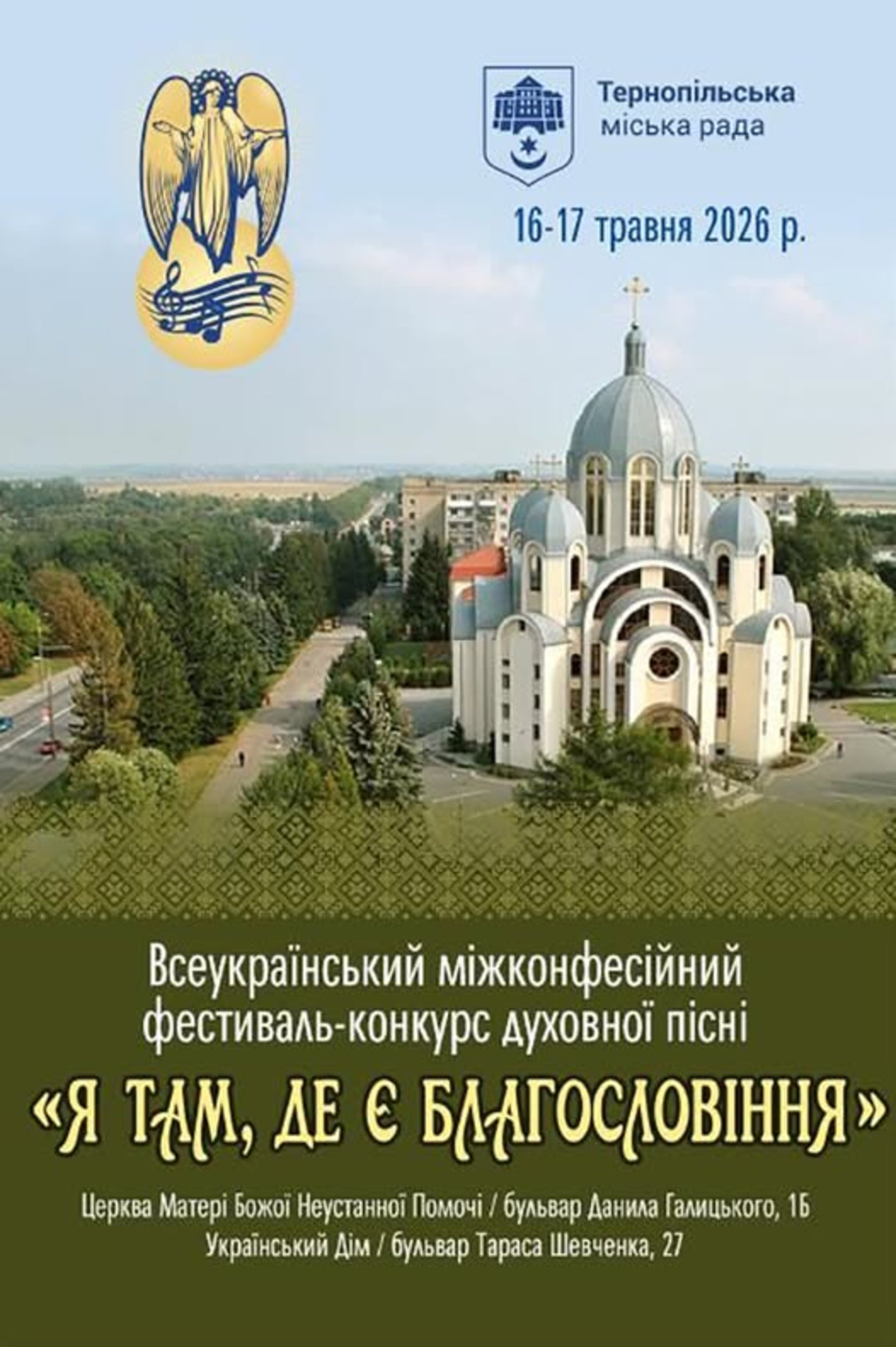 Всеукраїнський міжконфесійний фестиваль-конкурс духовної пісні «Я там, де є Благословіння» відбудеться 16-17 травня у Тернополі.